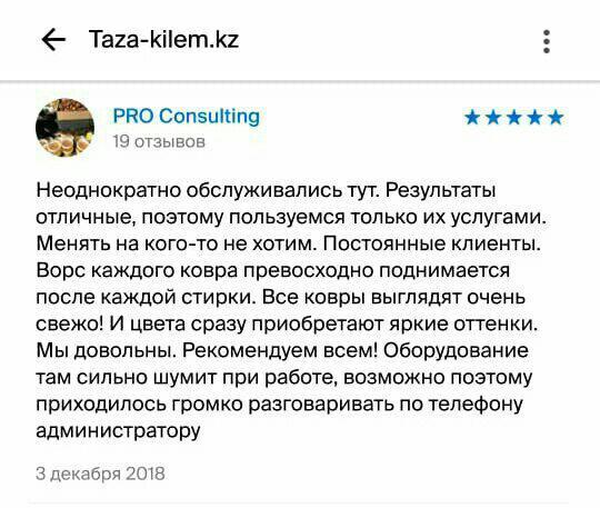 Неоднократно обслуживались тут. Результаты отличные, поэтому пользуемся только их услугами. Менять на кого-то не хотим. Постоянные клиенты. Ворс каждого ковра превосходно поднимается после каждой стирки. Все ковры выглядят очень свежо! И цвета сразу приобретают яркие оттенки. Мы довольны. Рекомендуем всем! Оборудование там сильно шумит при работе, возможно поэтому приходилось громко разговаривать по телевону администратору